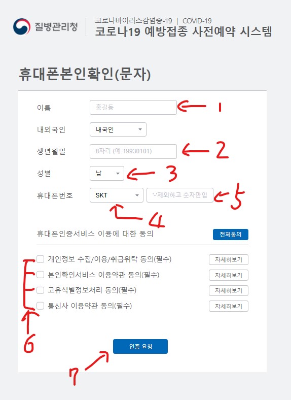 6. 휴대폰인증서비스 이용에 대한 동의는 모두 동의해야 합니다. 즉, 6번에 네모 모두 클릭해야 합니다.