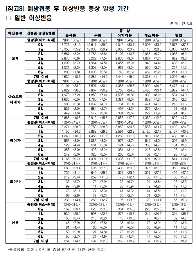 아래와 같이 일반이상 반응 증상 발생기간이 개인에 따라 다르기 때문에 주의깊게 확인을 하고 증상이 더 악화되는지 주의깊게 본인 혹은 주변사람이 확인을 하는 것이 필요합니다. 최대 이상발생 기간을 106일까지 보고 있습니다.