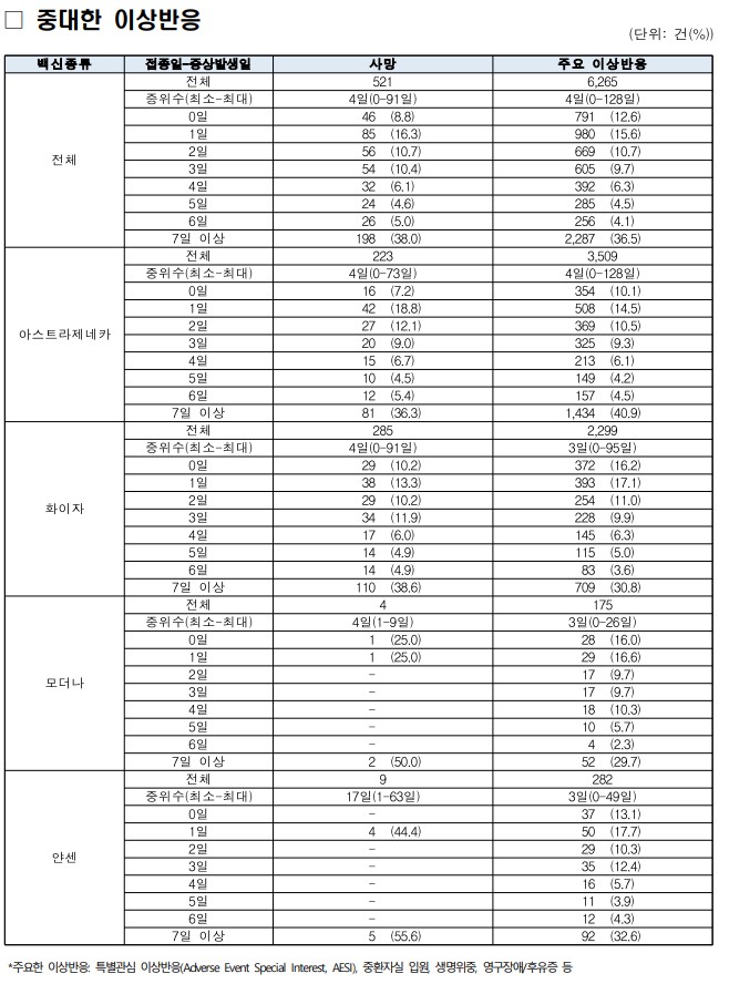 중대 이상반응은 아래와 같습니다. 반응기간으로 최대 128일까지 보고 있습니다.